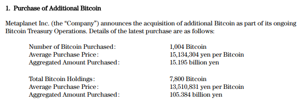 **Metaplanet Expands Bitcoin Holdings to 7,800 BTC with New Acquisition**